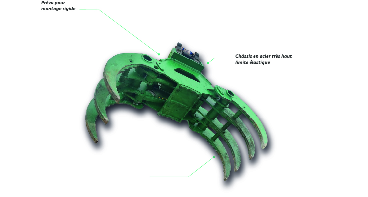 Les grappins bois énergie SEVE sont des pinces hydrauliques à deux bras synchronisées, actionnés par un vérin à double effet, avec un seul circuit hydraulique. Les flexibles hydrauliques sont protégés à l’intérieur du châssis, pour minimiser les risques de dommages. Le grappin multi usage est mis en mouvement par la machine sur laquelle il est monté. Les accessoires pour pelles forestières sont sûrs, efficaces et sont destinés à manutentionner les déchets verts, les branches d’arbres, les déchets organiques et les matériaux en vrac. à la fin du mouvement de fermeture, les pointes en Hardox 400 du grappin forestier multifonctions se croisent jusqu’à un diamètre minimum de préhension.